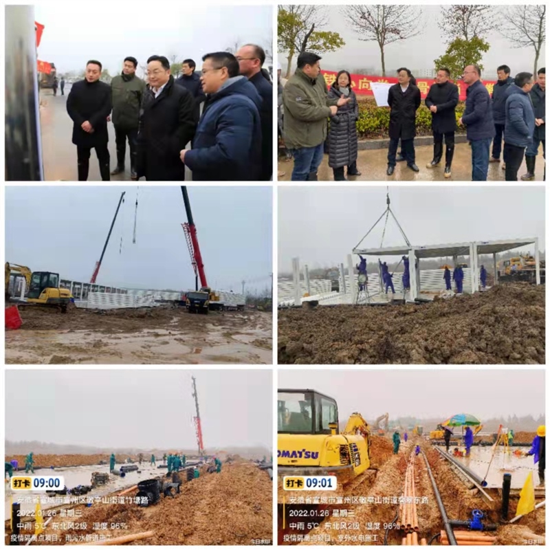 截止1月26日,現(xiàn)場已完成10000平方米混凝土硬化,雨污水管道、室外水電管道安裝進展迅速,集裝箱板房開始拼裝。天氣惡劣、工期緊迫,一線人員努力克服各種困難和障礙,迎難而上。1月25日下午,區(qū)政府召開宣州區(qū)新冠肺炎疫情防控工作專題會議,審定了隔離點項目方案,明確了相關(guān)事項,會議對施工進度和現(xiàn)場管理給予了充分的肯定,同時也要求在嚴把工程質(zhì)量關(guān)和隔離點各項要求的基礎(chǔ)上,倒排工期,加快施工,確保早日交付使用。