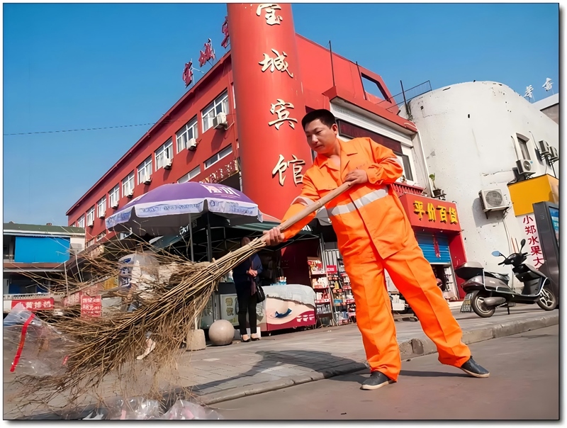 他每天早上四點多就準時出現(xiàn)在街頭,先是拿著大笤帚把街道從頭到尾普掃一遍,忙到上午八點多鐘,接著就拎著小掃帚和簸箕定點清掃。到了下午兩點鐘,他會再把整條街普掃一遍,一直要忙到五點多才能下班。大熱天里,他身上的衣服經(jīng)常是濕了干、干了又濕,白色的鹽漬積了一層又一層,他卻全然不顧。