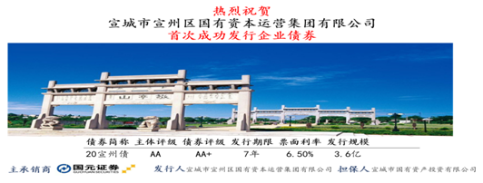 12月2日 ,我公司“2020年宣城市宣州區(qū)國有資本運營集團有限公司企業(yè)債券”成功發(fā)行。本次債券由國元證券有限公司主承銷,發(fā)行規(guī)模3.6億元,發(fā)行期限7年,主體評級AA,債項評級AA+,票面利率6.5%。本期債券為我集團公司首次公開發(fā)行企業(yè)債券,也是宣州區(qū)內(nèi)企業(yè)首次公開發(fā)行企業(yè)債券。